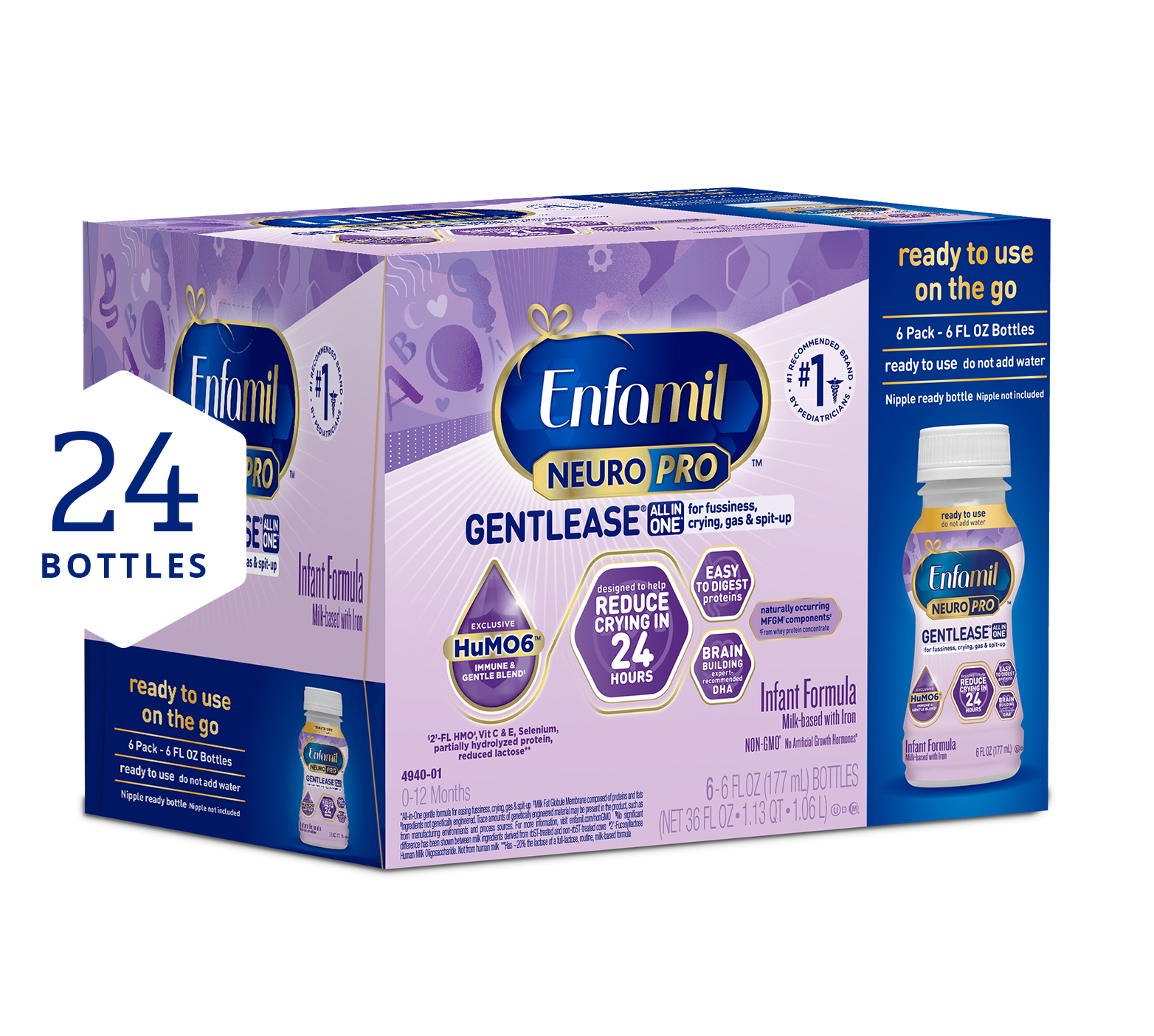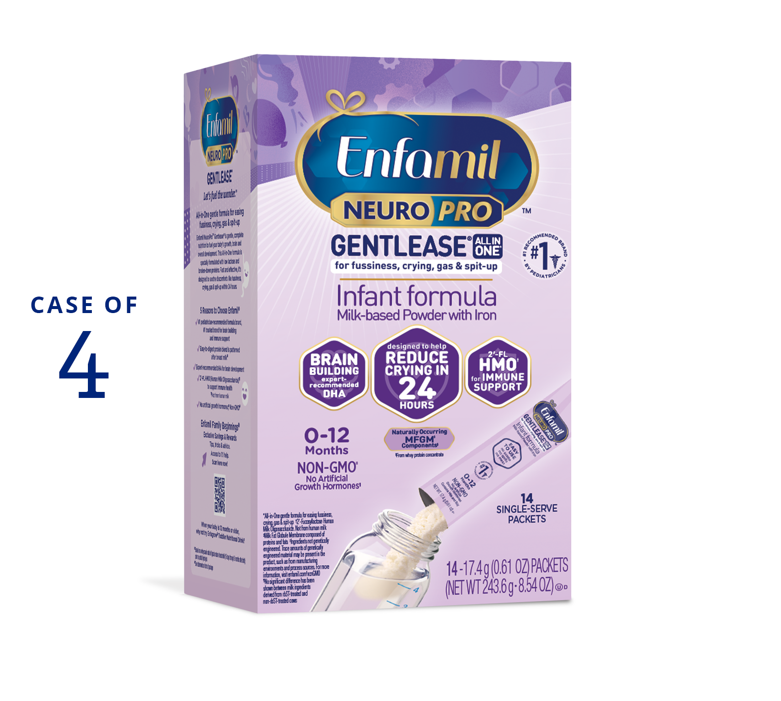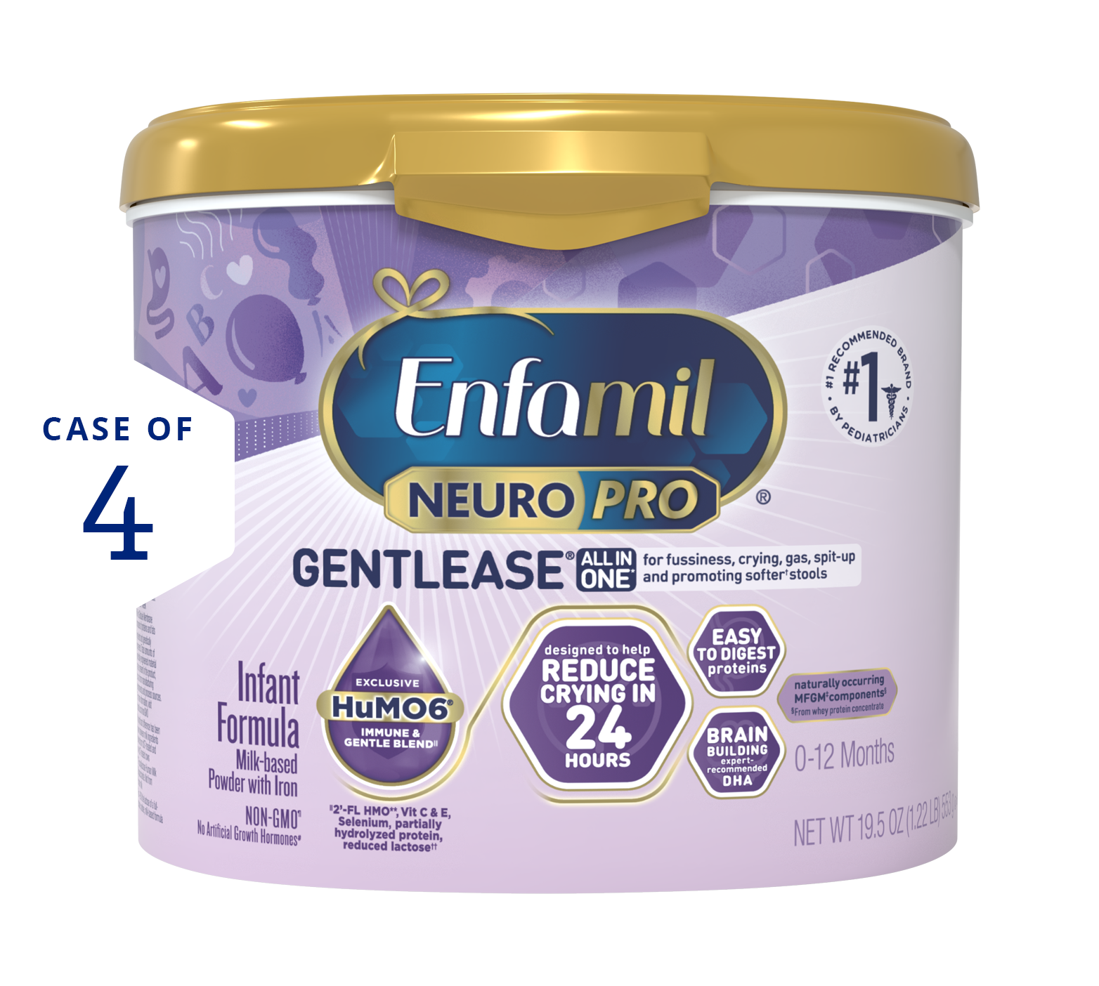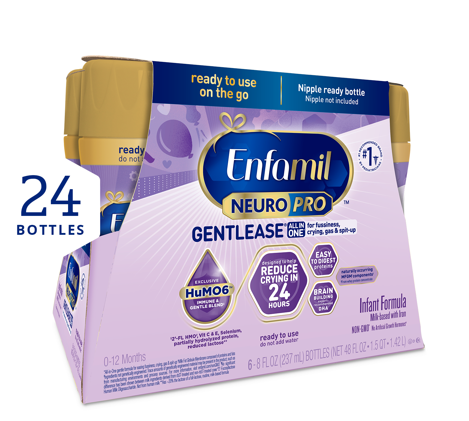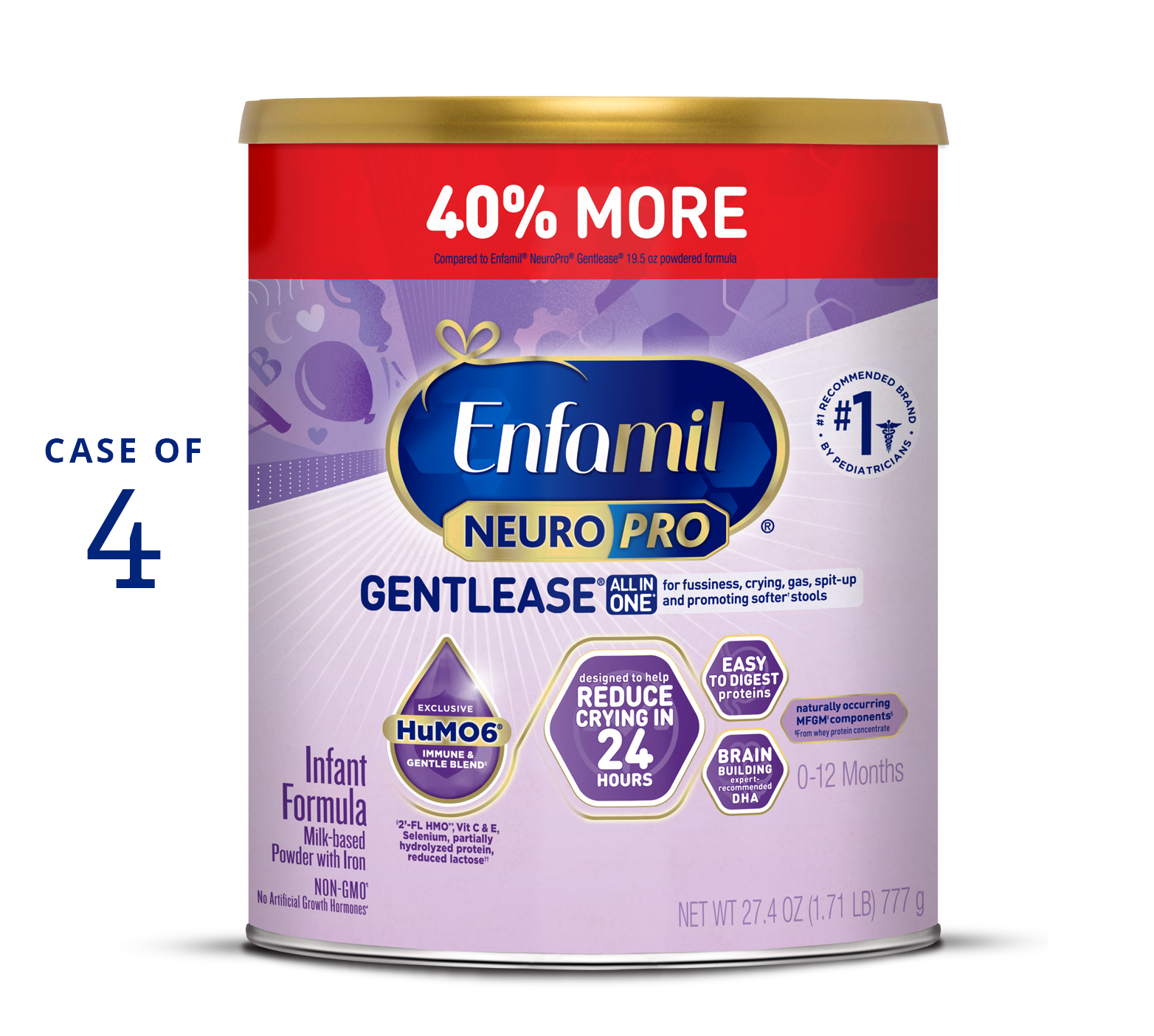 Our Gentlease formula is for gassy, fussy babies and is designed to ease fussiness, crying, gas and spit-up within 24 hours of use. Enfamil NeuroPro Gentlease has expert-recommended Omega 3 DHA.