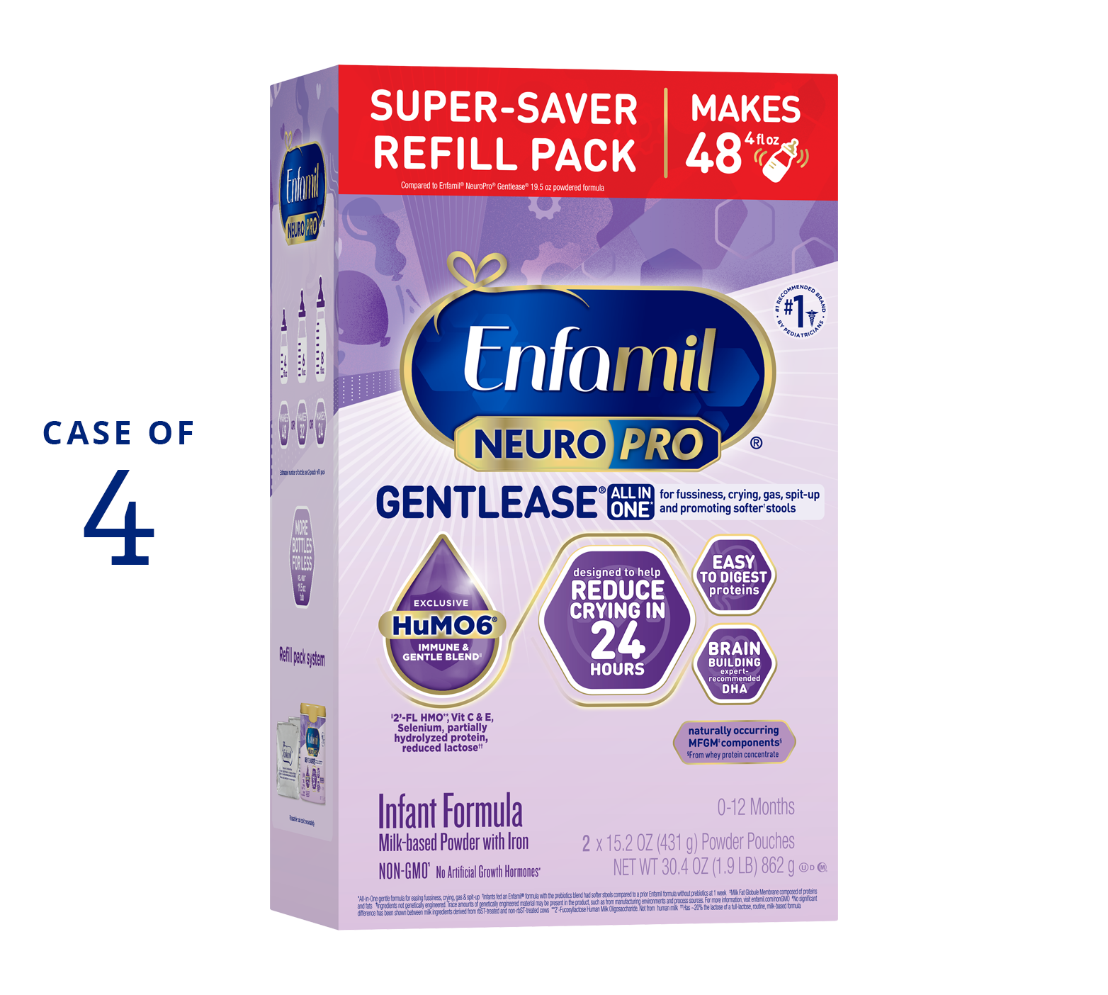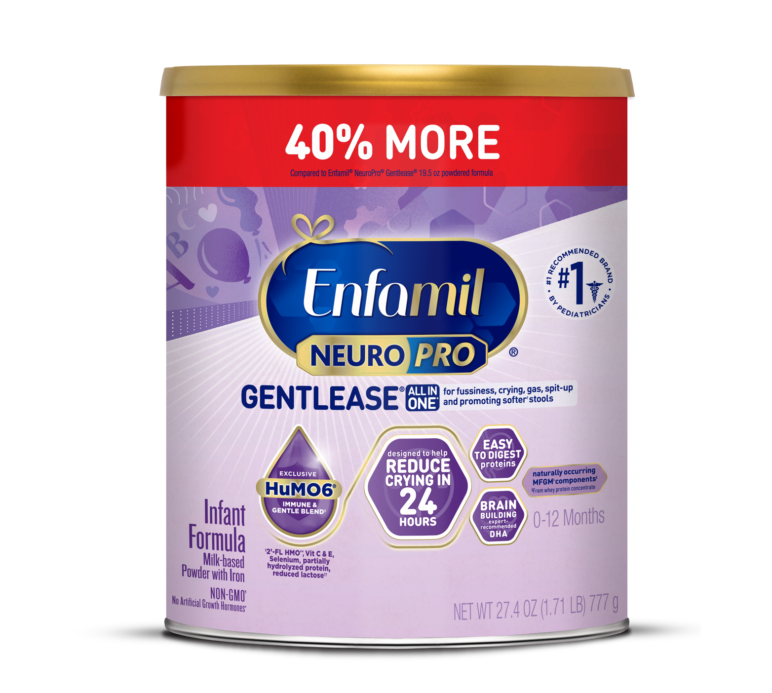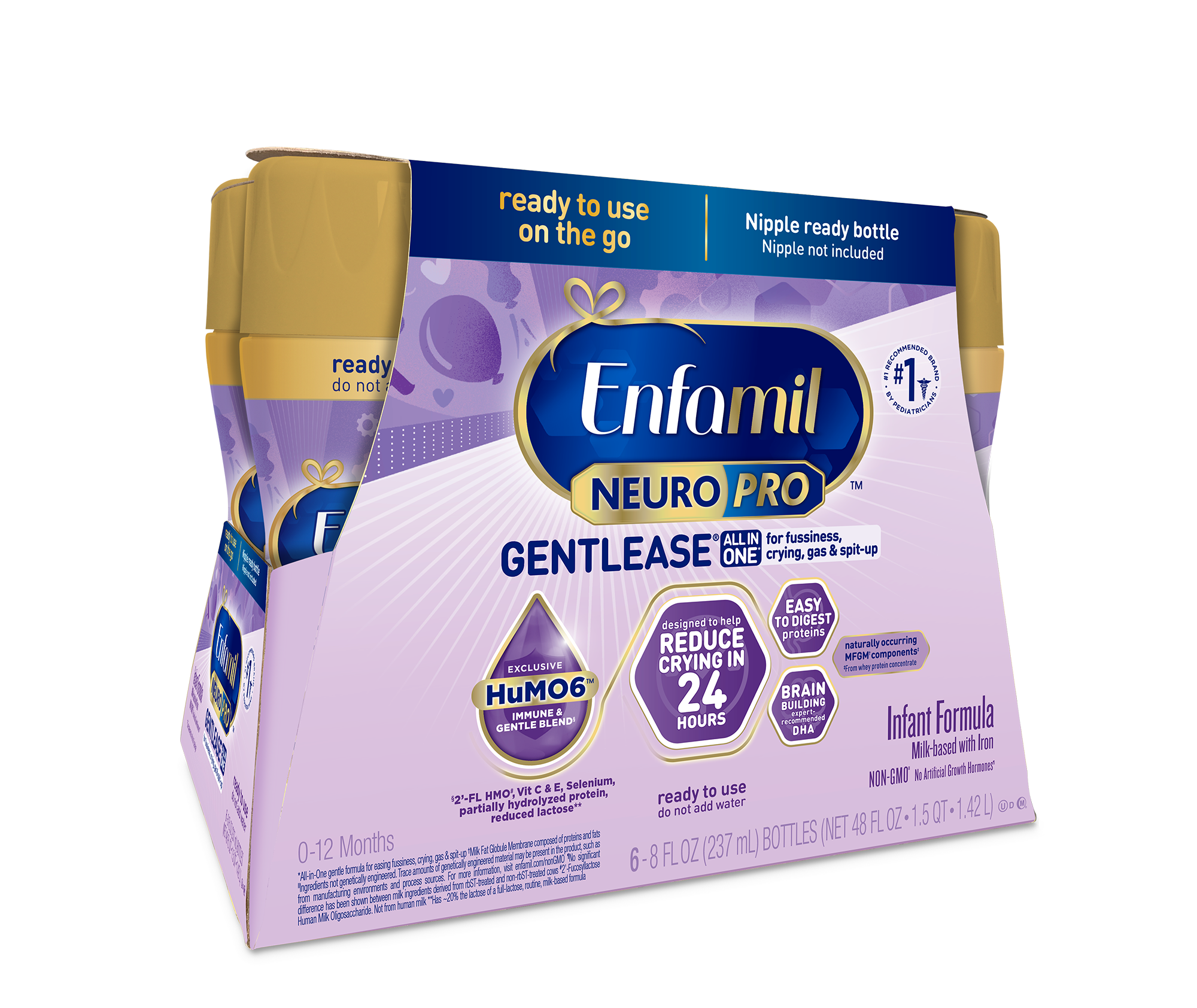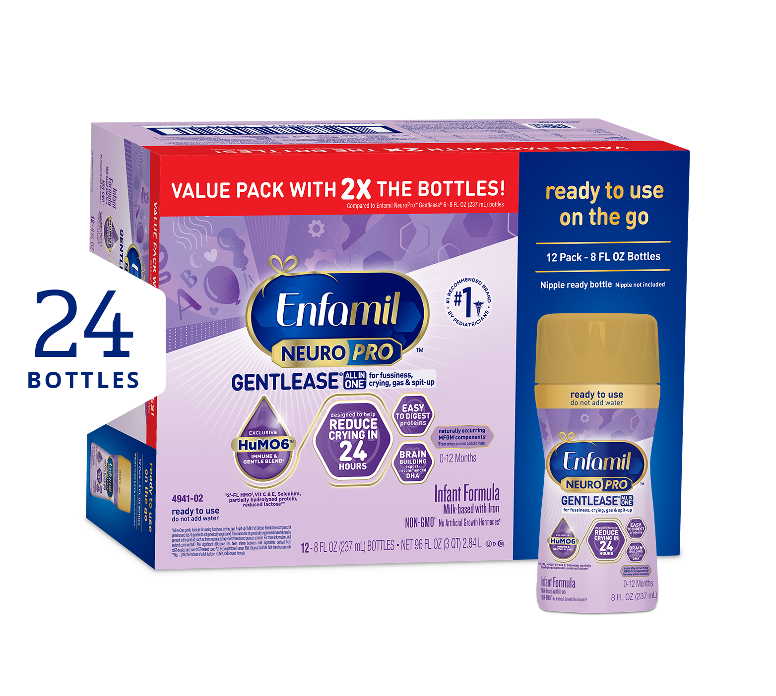 Our Gentlease formula is for gassy, fussy babies and is designed to ease fussiness, crying, gas and spit-up within 24 hours of use. Enfamil NeuroPro Gentlease has expert-recommended Omega 3 DHA.