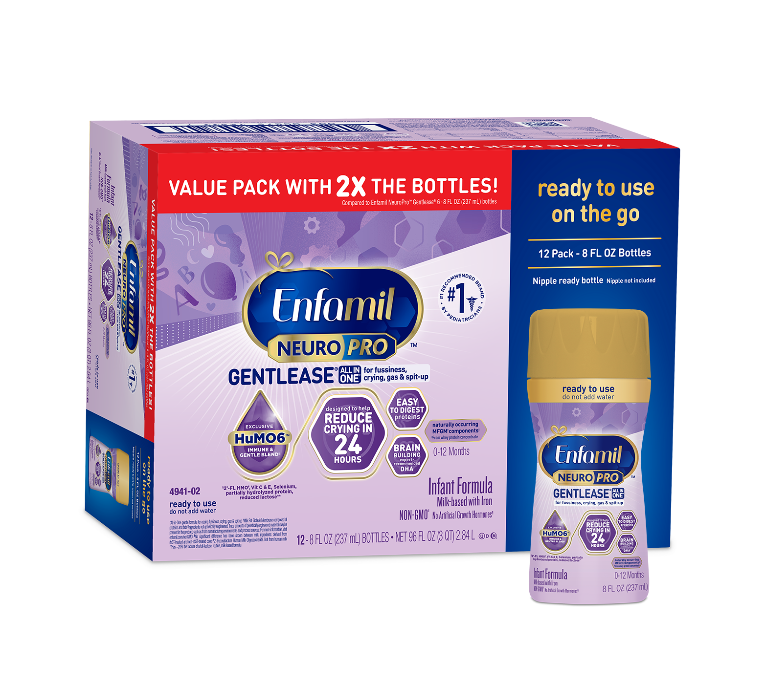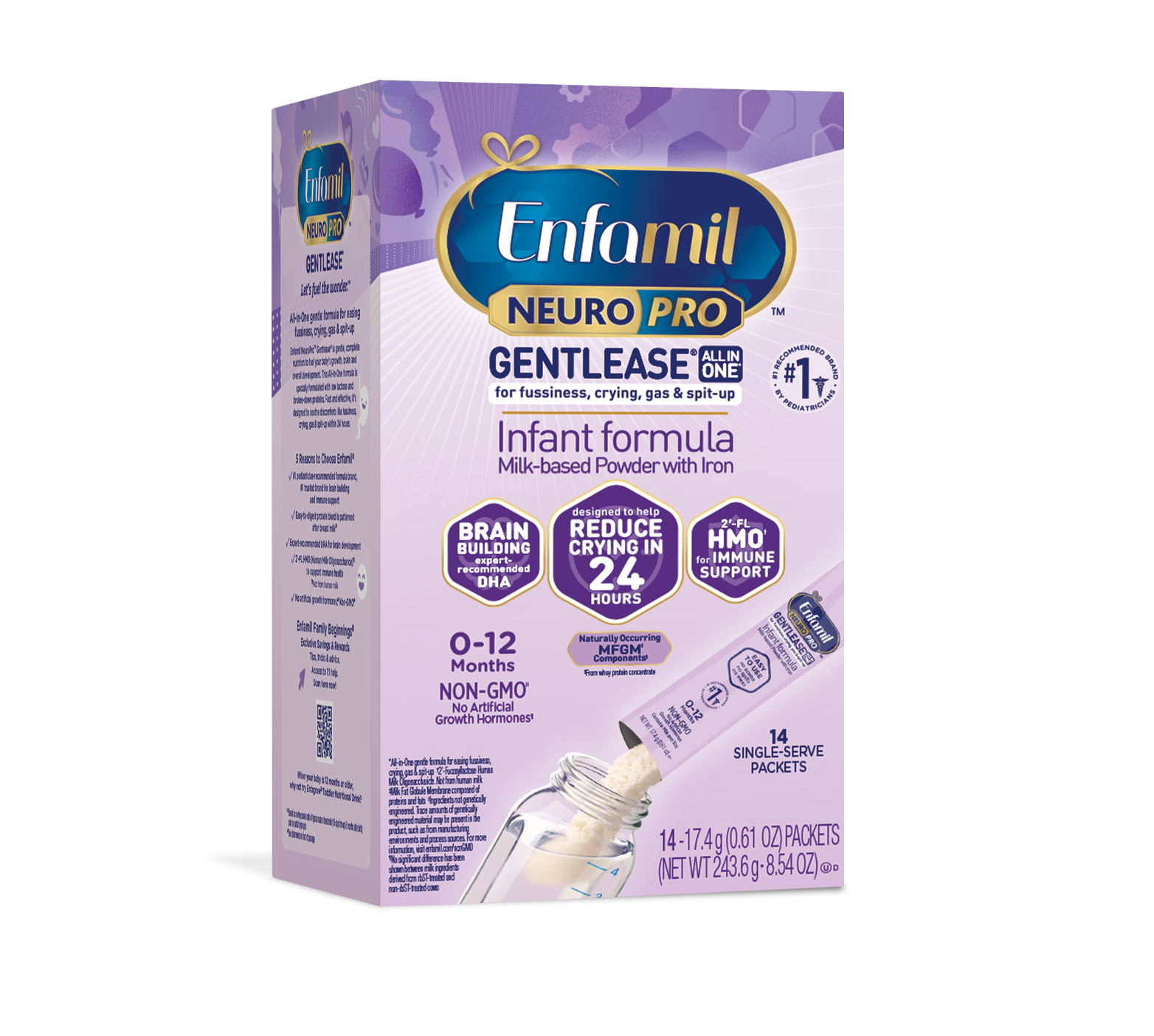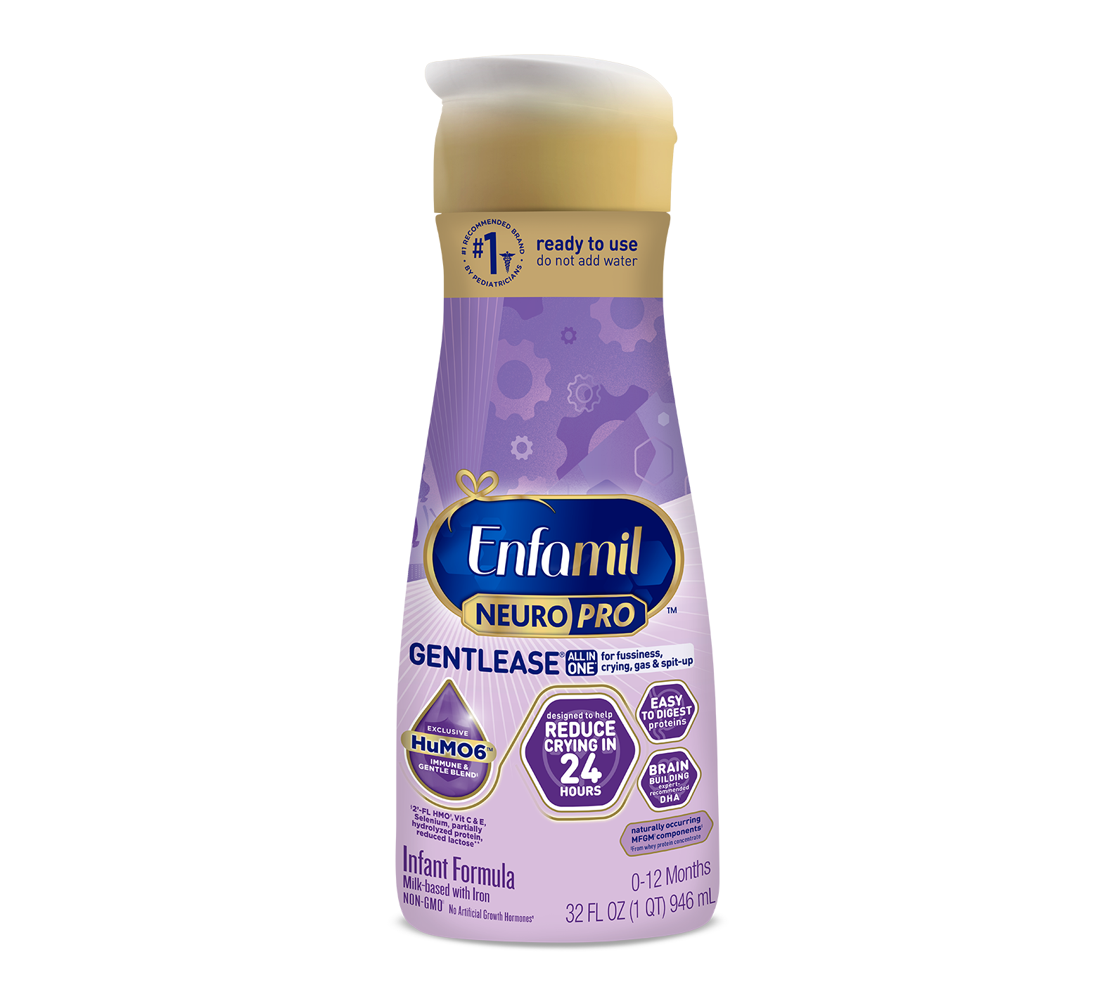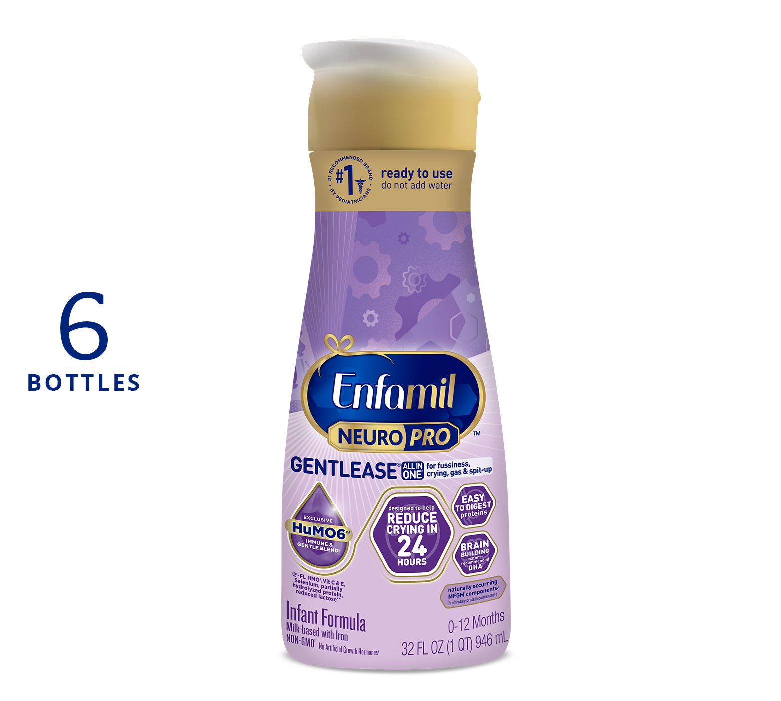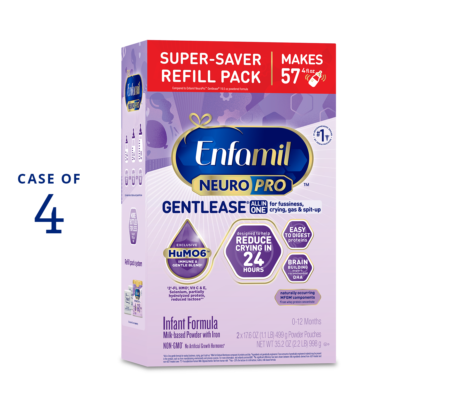 Our Gentlease formula is for gassy, fussy babies and is designed to ease fussiness, crying, gas and spit-up within 24 hours of use. Enfamil NeuroPro Gentlease has expert-recommended Omega 3 DHA.