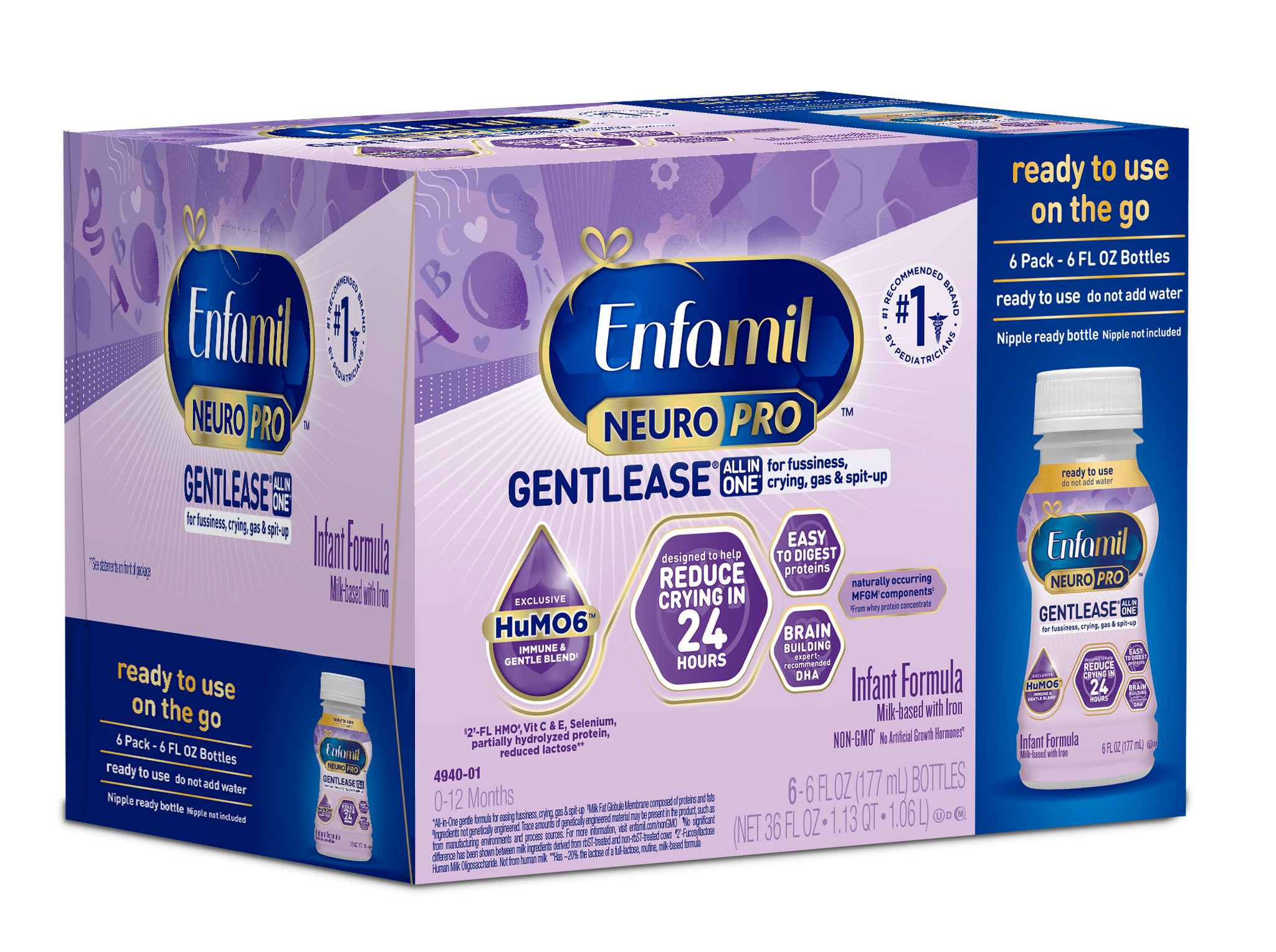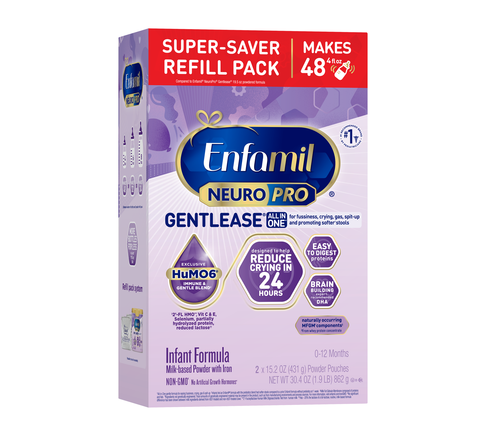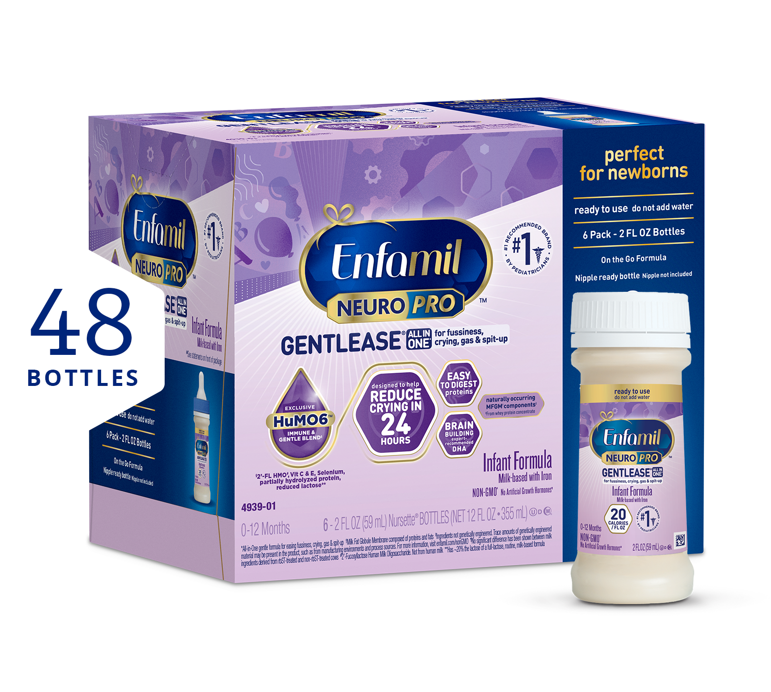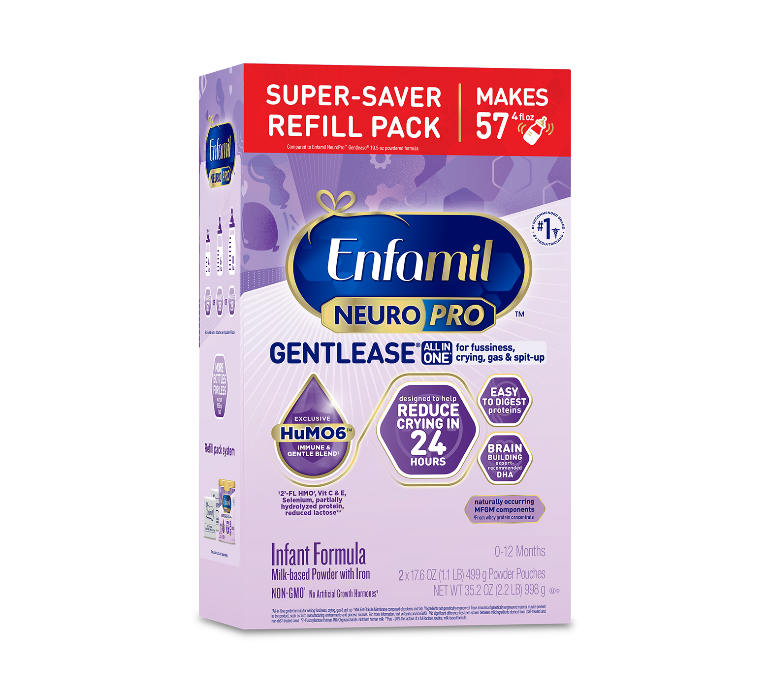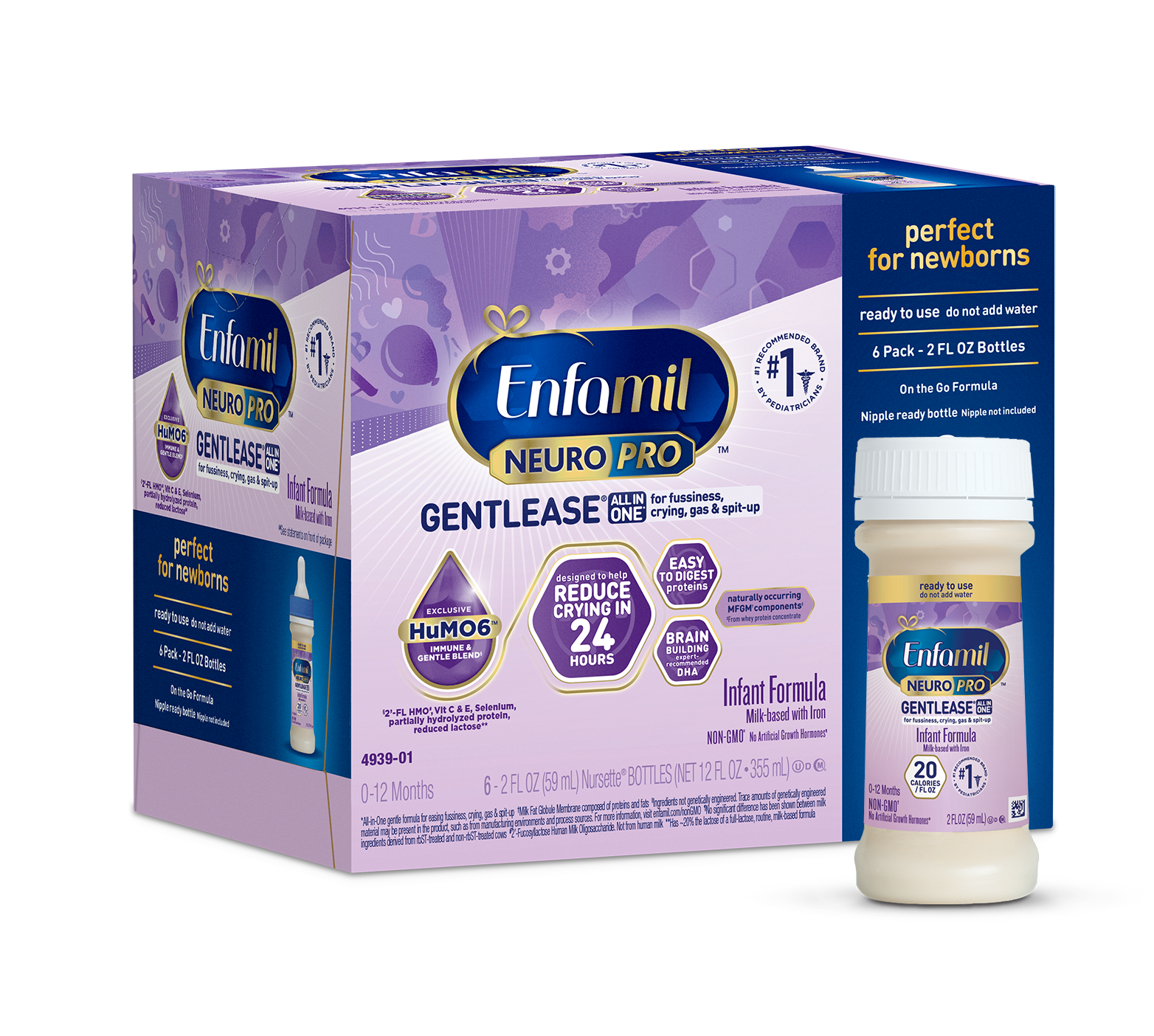 Our Gentlease formula is for gassy, fussy babies and is designed to ease fussiness, crying, gas and spit-up within 24 hours of use. Enfamil NeuroPro Gentlease has expert-recommended Omega 3 DHA.